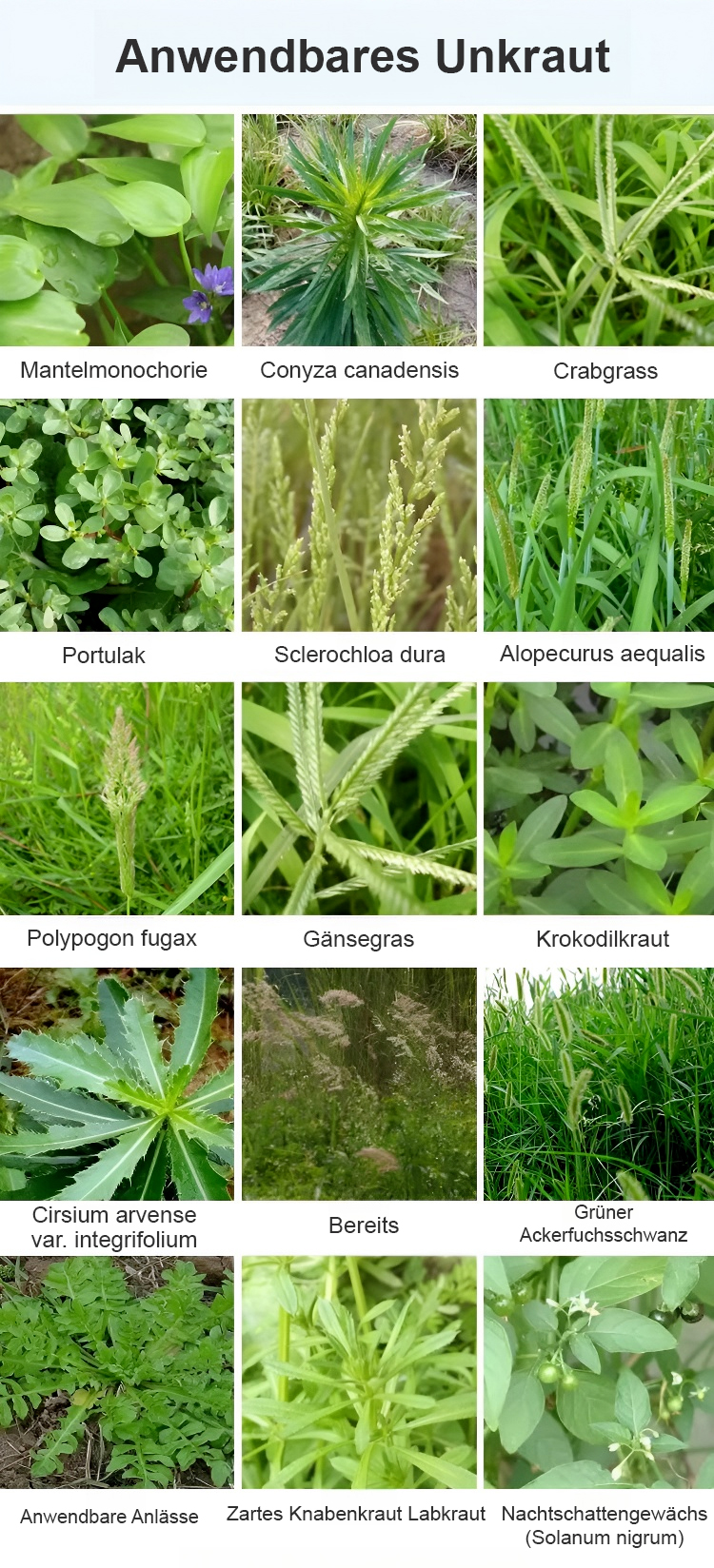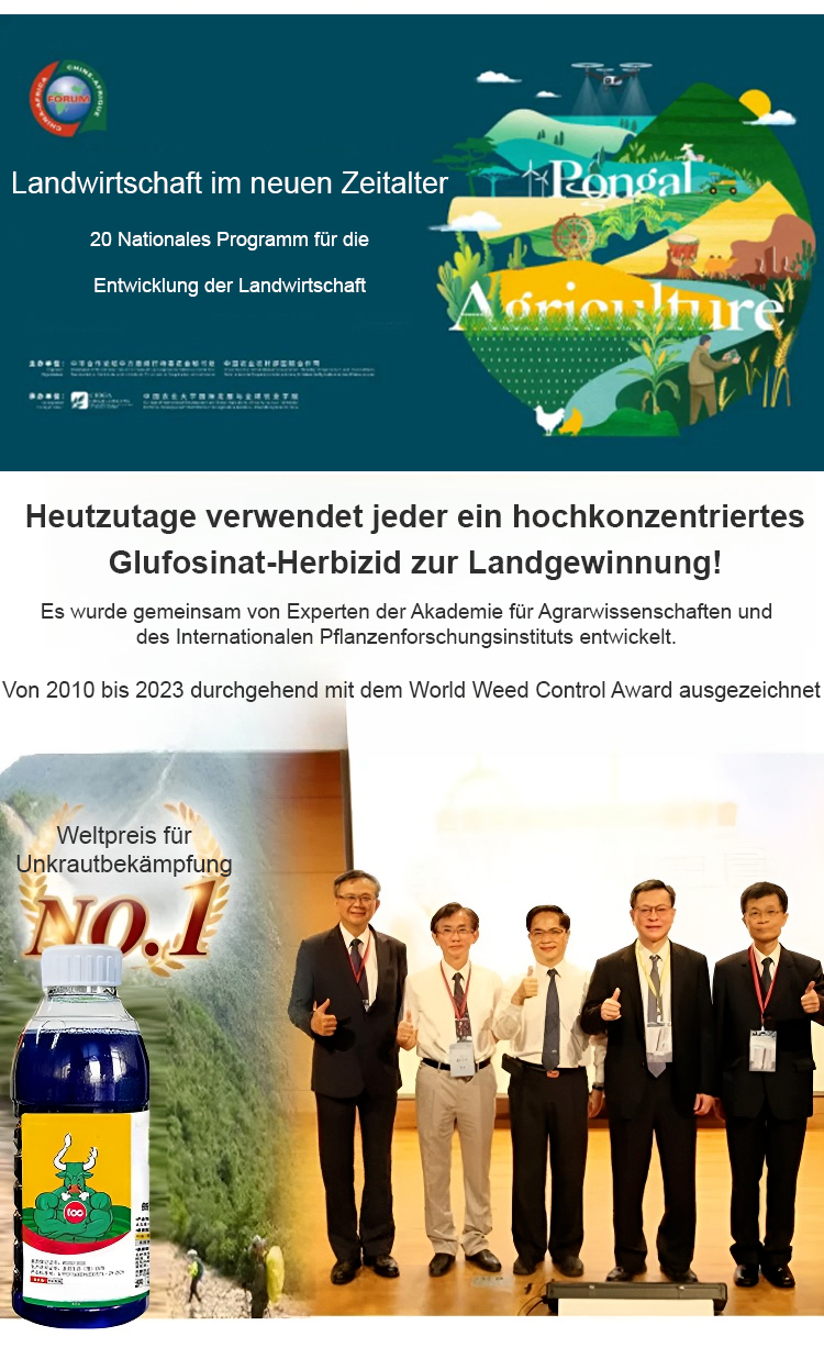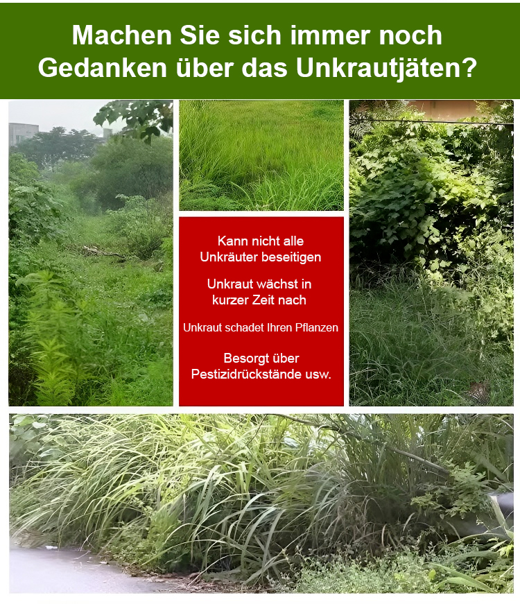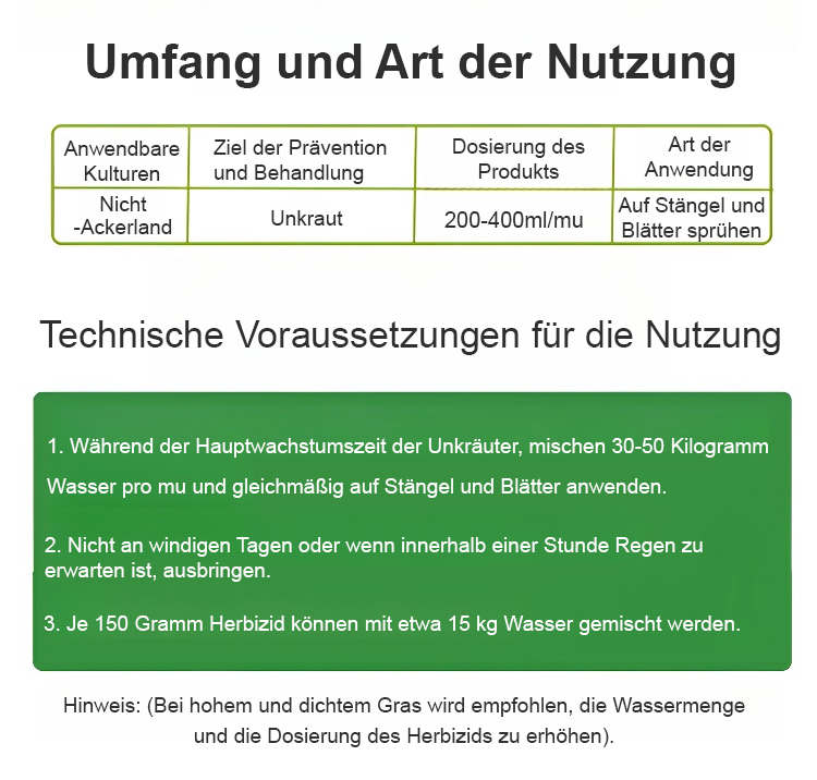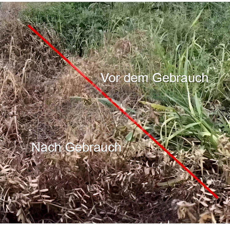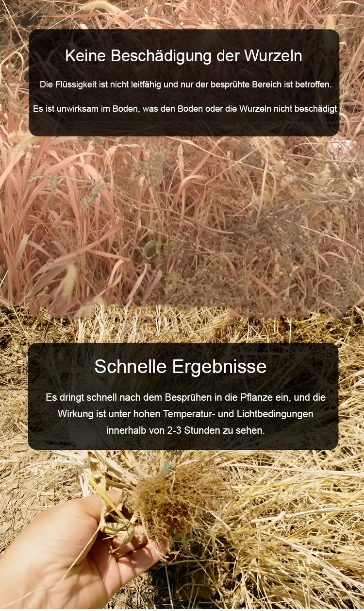 Gründliches Unkrautentfernen, schadet dem Boden nicht, eine Flasche reicht für 3-5 Morgen Land.